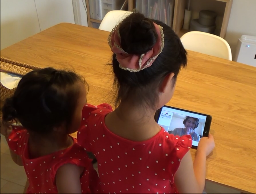 初めてのオンライン英会話教室、時間を前に妹と一緒に画面の前で待ってます。