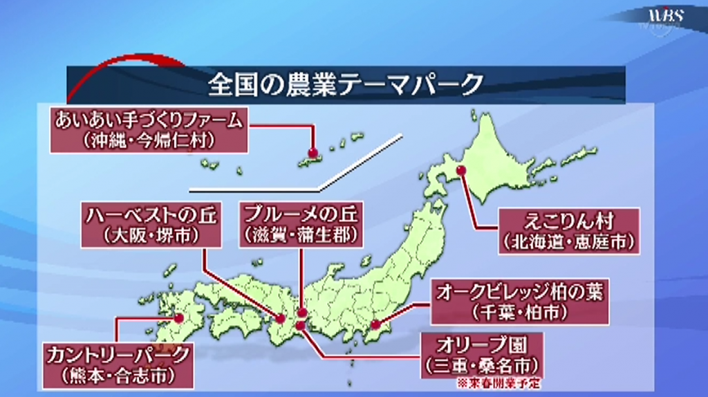 日本国内での農業テーマパークは2017年開業予定のオリーブ園等、北から南まで様々な地域にあります。